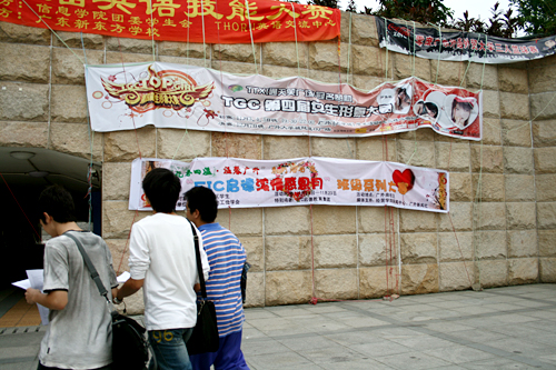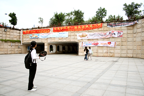 本学期初,学校下达了关于校内活动宣传地点和方式更改的新规定后,校道两旁的横幅骤然消失,而人流渐见密集的隧道成为广告宣传的新宠。除了各色横幅外,一些造型别致的展览物品也进入了人们视线。同时,过去备受冷落的橱窗也重新引起了师生的关注。隧道摇身一变,成为校园广告必争之地。