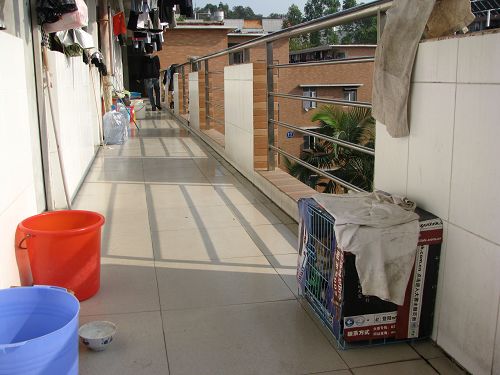 男生宿舍区,更是猫的天下。有人笑称“宿舍区的猫组成几支足球队都不为过”。小猫在宿舍楼前的空地自由玩耍,偶尔也有学生加入游戏的队伍,与猫玩耍起来。9栋楼下,时常可以看到这样的画面:小猫安静的趴在某一学生身旁,怡然自得,享受美妙的“日光浴”;又或者是某个学生兴致来了,向蜷缩在一角的小猫抛球儿玩乐;学生从宿舍楼中走出,小猫不自觉跟在后面来回走动,俨然扮演着“小保镖”的角色……一些男生在宿舍外面放有不同形状的猫窝供猫休息。这些窝,大抵都比较简陋,在纸皮箱或者脸盆里铺几块毛巾或者衣服,然后猫就可以在里面居住。也有一些专门笼子来给猫居住,并喂养它的一日几餐。