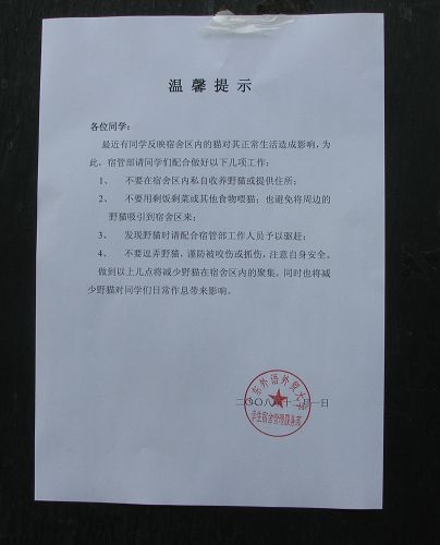 不满的声音传到宿管部,宿管部听到同学反映后,于12月1日在各个宿舍区贴出了温馨提示,要求同学们不要喂养流浪猫以配合宿管部的工作。随后几天,宿管部还对各个宿舍区进行了巡查,清理了学生提供给流浪猫住的地方,收走了一些猫窝,有的还进行了现场拆卸。但两项行动都收效甚微。学生得悉后,照样把窝弄回原样,照样给猫食物吃,流浪猫还是一如往昔地生活。12月初,他们还组织了一次整顿流浪猫的行动,目的是想把部分流浪猫放养到白云山上,后来几只放养的猫也还是找着路回来,回到原来住的地方。宿管部经理冯文成说,他们执行的时候遭到了某些同学的强烈阻止,他们对同学们的行为感到非常为难。