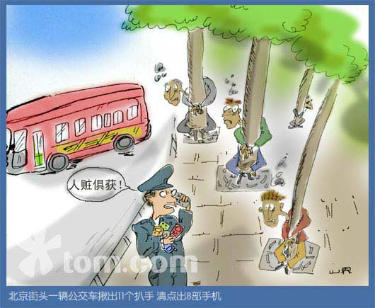 “街头一辆公交车上揪出11个扒手 清点出8部手机”