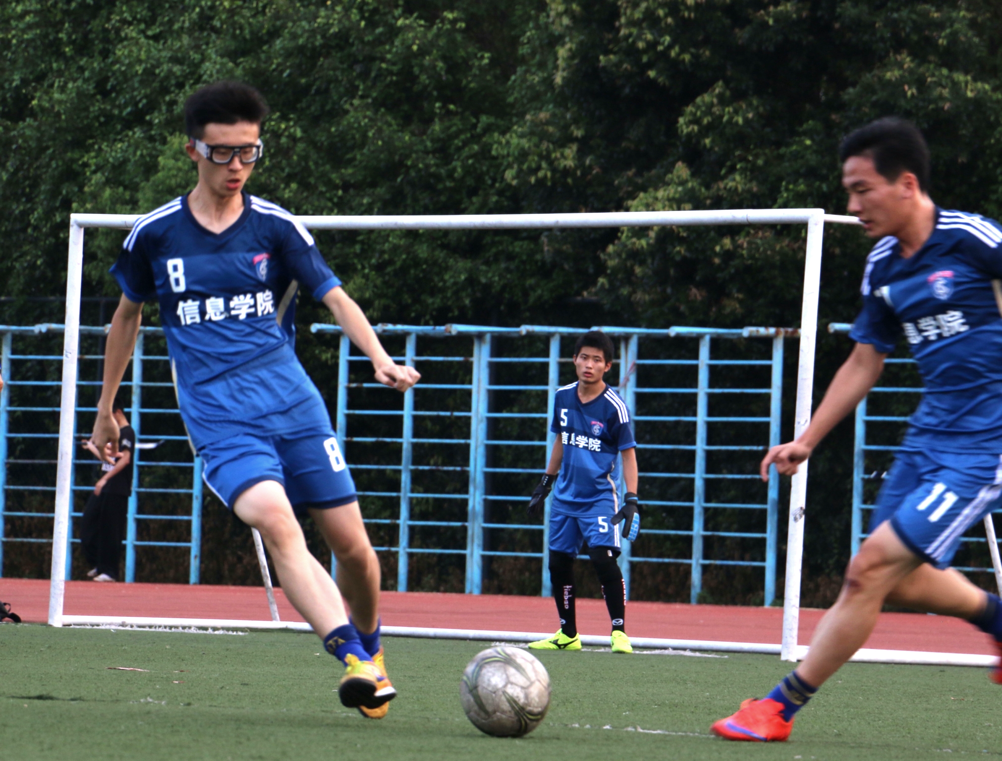 五月骄阳正盛,假草场上,信息足球队对阵新闻足球队的比赛硝烟正起。一开场,信息学院就被抢走球权,受到连续猛烈攻势,对手三次深入禁区,欲直塞射门,但无奈被信息学院固若金汤的防守一次次被突破。场面一度焦灼。然而在上半场补时,信息学院足球队11号球员带球连过两人传给45号球员,45号射门被扑出,这时15号球员抓住时机,凌空补射进门,使信息学院以1:0的优势领先。在一次次攻防后,信息学院最终以2:1赢得比赛。令人意想不到的是,如此一支劲旅,在此前半年的征战中竟无一胜场。而完成逆袭的关键人物就是当时的球队队长、现将毕业的郭济端。