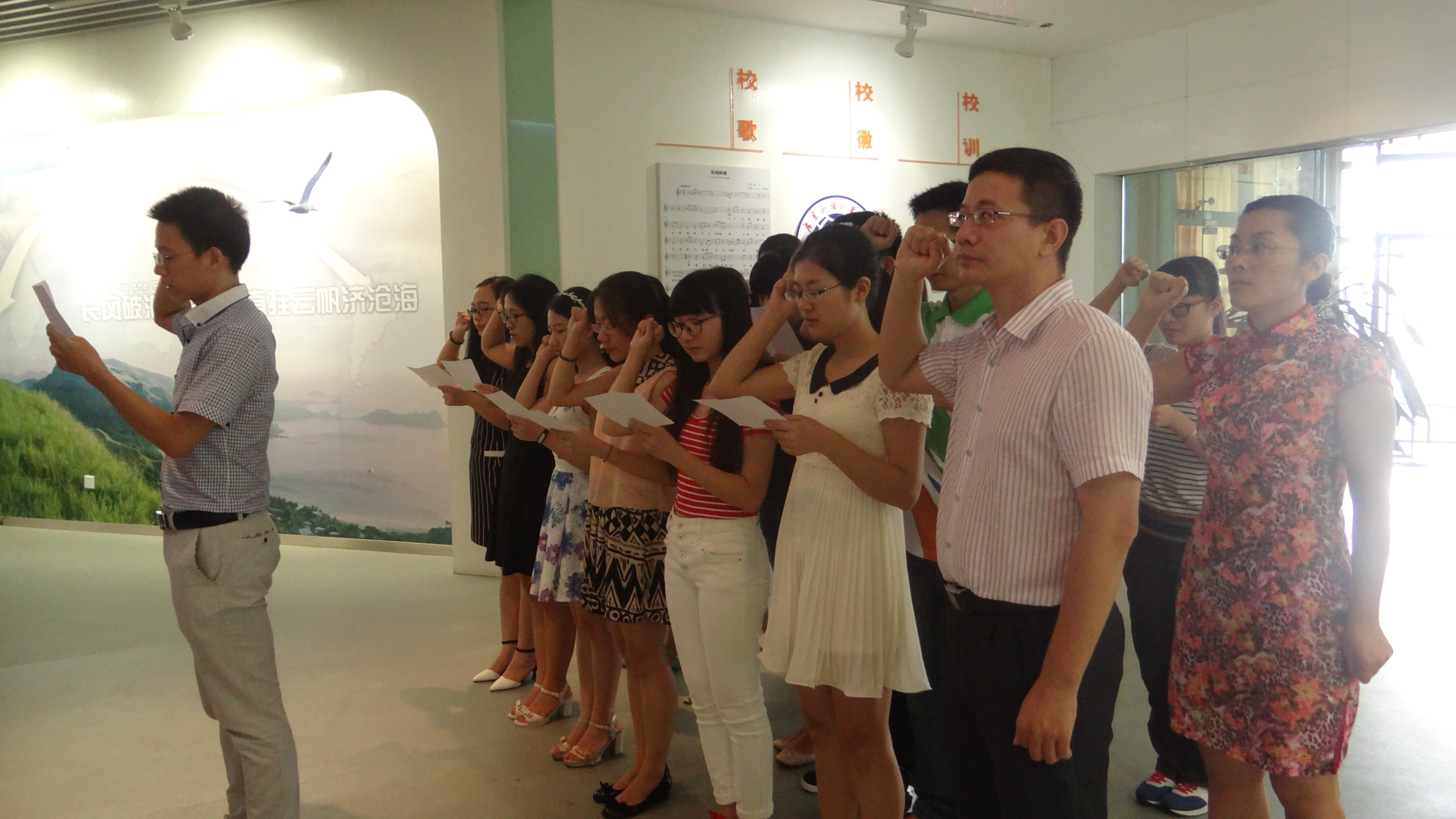 本网讯 6月30日,伟德bv国际体育高级翻译学院本学期新发展的17名预备党员和刚转正的正式党员在院党委书记刘志军、副书记杜焕君的带领下参观了学校校史馆并进行了入党宣誓。