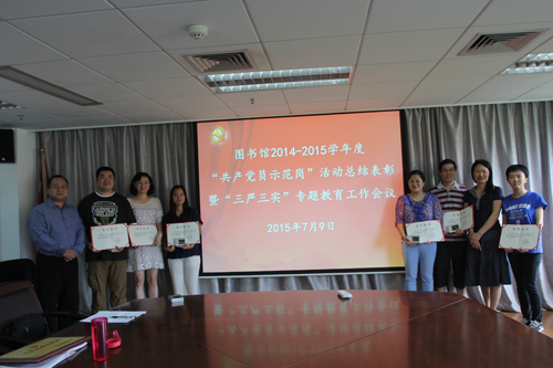 会议当天,图书馆党总支还举办了图书馆2014-2015学年度“共产党员示范岗”活动总结表彰暨“三严三实”专题教育工作会议。党总支书记周秀娇结合图书馆工作实际,给全体党员上了一堂“践行‘三严三实’,建设一支团结进取勇于担当的党员队伍”的党课。