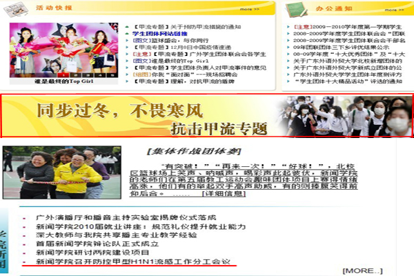 网络是个好平台——点击进伟德bv国际体育各学院的网站,其中也不乏对于预防甲流的宣传。新闻学院与翻译学院重视网络的传播效应,在其首页或显眼的地方放置对抗甲流的小tips。新闻学院辅导员商杰强表示,通过这种方式可以提高学生的防范意识。此外,学院建立一套晨检和午检的检查制度,一旦发现有学生发烧超过38度将马上告知校门诊部。而财经学院辅导员沈长霞向记者展示学院预防甲流的创新做法,她打开了一个Q群,“这是我们财经各个班级的班委成员的QQ群,我们一有关于甲流的消息就在此公布和传达。”