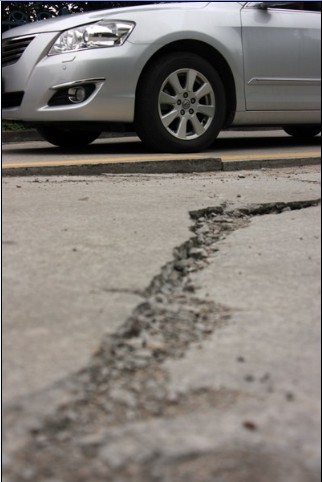 近日,记者发现由14栋宿舍通向清雅园的道路路面上出现了约十五米长的裂缝,疑是不堪重负而导致的。据了解,最近经过该路面的重物也只有装载建材的货运车。记者在现场观察到,该路左右侧路面中心均出现六到七米长的裂缝,而右侧路面更是明显凹陷,凹陷最深处达8厘米左右。小车经过此片区域时也会明显地降速,路人更能够听到清晰的“哐当”响声。路上行人接受采访时不约而同地表示,路面开裂存在着一定的安全隐患。
