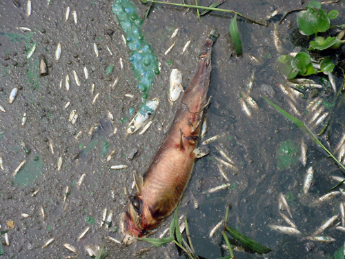 “今天早上上课,就觉得湖水特别臭,往外一看,发现水面上布满了白花花的死鱼。”艺术设计专业的吴同学告诉记者。 “以前的湖水都是淡青色的,今天突然发现有很多黑水流进来,把河分成黑色和青色两半,死鱼就浮在黑色的水面上。”站在旁边的徐同学补充道。据了解,以前湖水从来不会臭也从来没有出现大面积死鱼的现象。