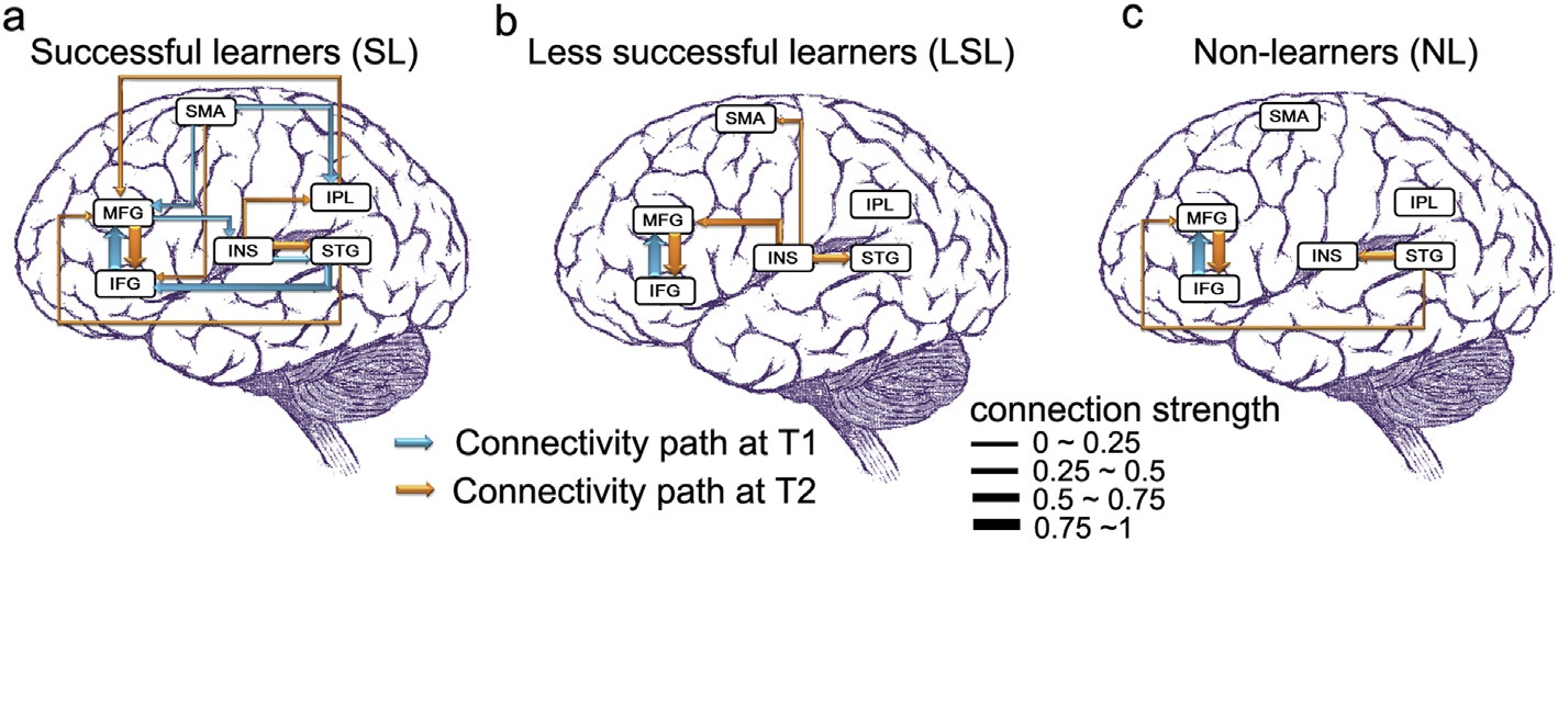 六周汉语学习前后(T1/T2)大脑的功能网络连接变化。