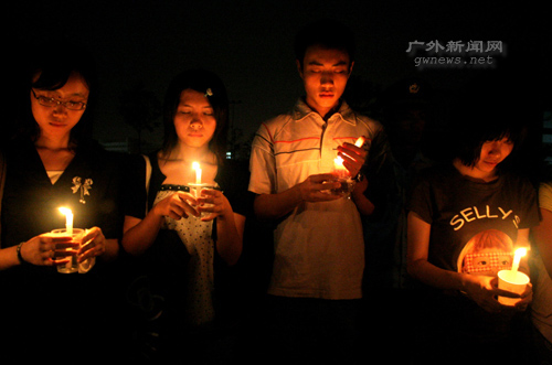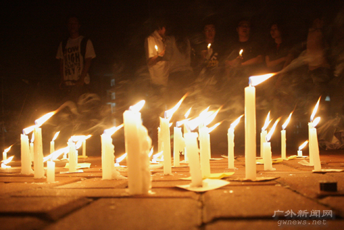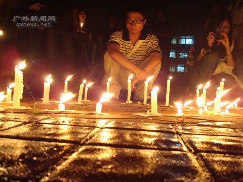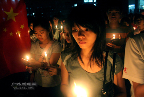 5月19日,正值5·12汶川大地震七日祭。当晚,伟德bv国际体育学生自发组织了一系列悼念活动。图书馆广场、中心湖、宿舍区,同学们齐聚,点燃蜡烛,哀悼遇难同胞。