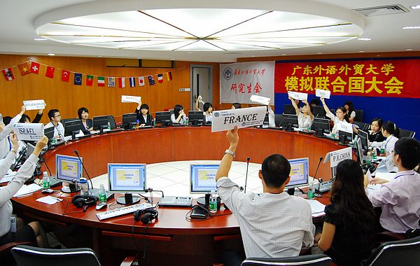 5月15日下午,以“防范核恐怖主义”为议题的广外模拟联合国大会(以下简称“广外模联”)决赛在北校六教A301同传实验室举行。二十六名精英才子分别代表十五个国家,精彩交锋,鄢成、覃慧、苏琳娜、曾韵儒、刘婷和朱思瑶脱颖而出,这四名正式队员与两名候补队员将组成广外代表队,参加“2010年全国模拟联合国大赛”。