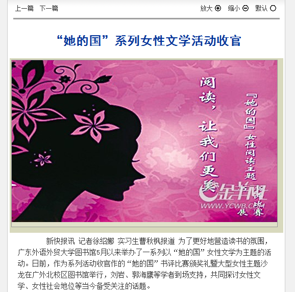 2009年的分享,2010年的融会,2011年的幸福,历经多年的试探和摸索,让图书馆“世界读书日”活动月逐渐走向成熟和跨越。2012年,我们尝试将目光投向读者,从读者中去发掘图书馆活动的主题,于是占广外大多数的美丽女性进入了我们的视野,图书馆推出了以“她的国—女性阅读”为主题的系列活动。分别有:“阅读,让我们更美—“她的国”女性阅读主题书展”、“女性阅读书评比赛”、“女性影像视频展播”、“女性研究电子资源展示”、“她的国——女性阅读主题沙龙”、“她的国——女性阅读”获奖作品集赠送等活动。