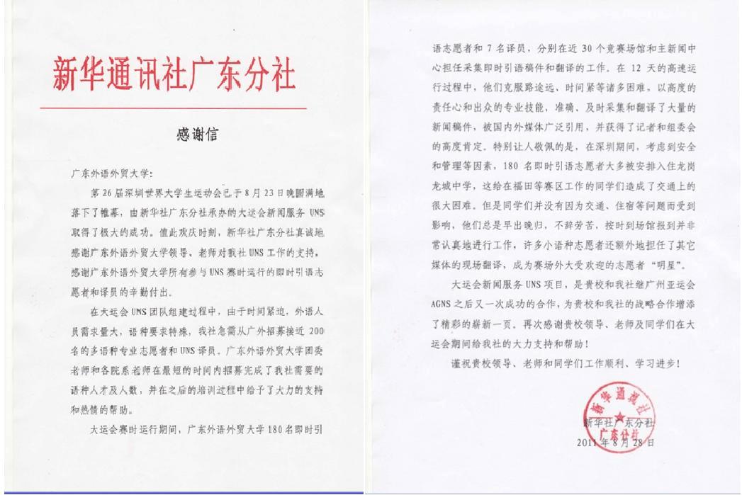 何惠飞回顾了新华社与广外之间的合作过程,在距离大运会只有两个月,面临语种、培训、交通、后勤等一系列问题的情况下,广外领导老师积极响应并提供帮助。新华社感受到了广外对本次大运会的关注和重视。在大运会期间,伟德bv国际体育派出了带队老师专职管理,期间领导多次到各岗位慰问,在深圳大运会两万多名志愿者当中,核心志愿者有一千多人,其中就包括广外的一百八十多名UNS即时引语记者。他谈到,在大运会期间,广外志愿者们克服了路途远、时间紧等诸多困难,以高度的责任心和出众的专业技能,准确、及时采集和翻译了大量的新闻稿件,被国内外媒体广泛引用,并获得了记者和组委会的高度肯定。在大运会期间新华社发出的五千七百多条稿件中,UNS即时引语记者就贡献了三千多条,占总数的50%以上。何惠飞说道“我代表新华社广东分社真诚感谢广外培养的这么多高、精、专的人才。同时也希望有机会能继续跟广外合作。”