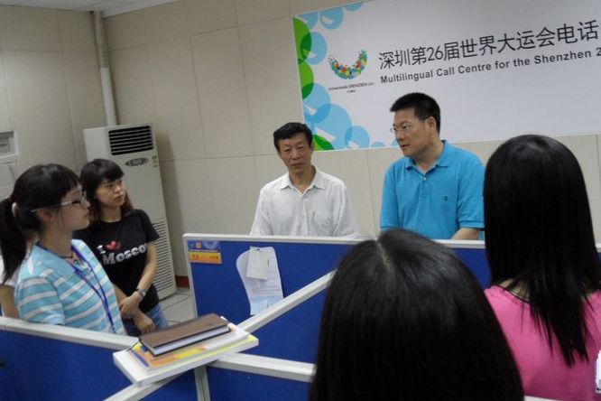 本网讯 8月8日下午,校长仲伟合、校党委副书记许国彬在校团委书记谢秀兰、东语学院党委副书记林茂辉、高翻学院党委副书记杜焕君等的陪同下莅临北校六教深圳大运会电话多语言服务中心(下称“多语服务中心”)视察指导,并关切地慰问、寄语多语服务团队志愿者。