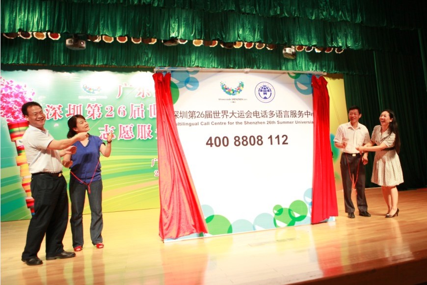 紧接着,张文杰、陈梦飞、许国彬和谢秀兰共同为深圳大运会电话多语言服务中心揭牌。