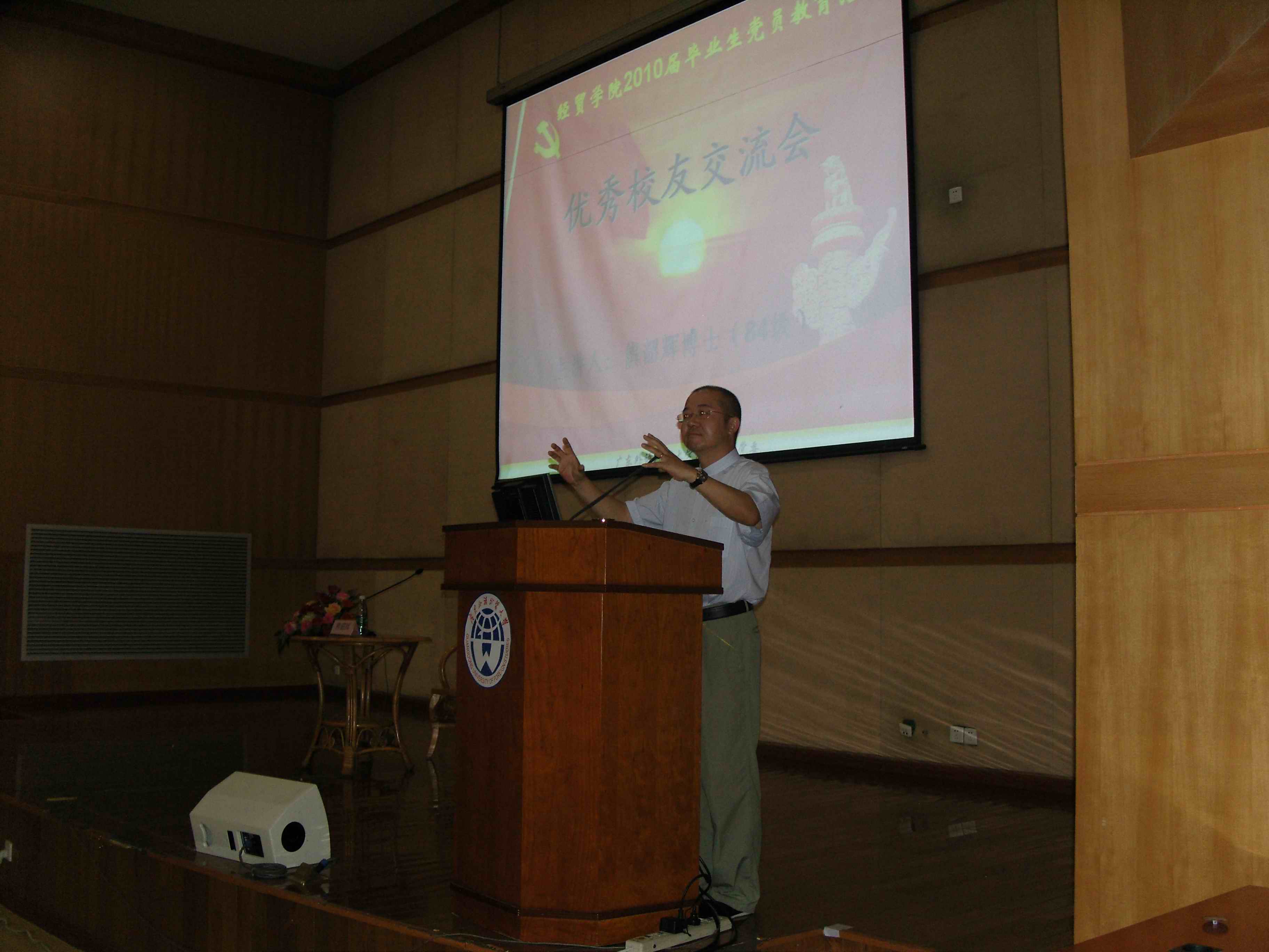 本网讯 5月21日,经贸学院2010届毕业生党员教育活动之优秀校友交流会在南校区图书馆多功能报告厅举行。学院84级校友熊韶辉博士受邀与毕业生党员分享成功经验,带来了一场思想盛宴。学院党委副书记康为茂及学工办老师参加了交流会。教育活动由陈健老师主持。