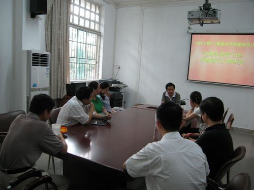 本网讯 5月28日下午,西语学院科技活动月学术沙龙活动在北校区第四教学楼207、209、212室举行,全院教师分组围绕不同的主题展开研讨。此次学术沙龙是科研处策划的以“科学规划谋发展,精细管理上水平”为主题的2010年科技活动月的一个重要活动。科研处副处长王小海分别到各组研讨会现场进行指导,介绍科研处筹划“科技活动月”的宗旨及如何更加有效地开展学术科研活动。王小海为如何深入开展欧洲文化研究提出了宝贵的建议,与在场教师交流研究心得。