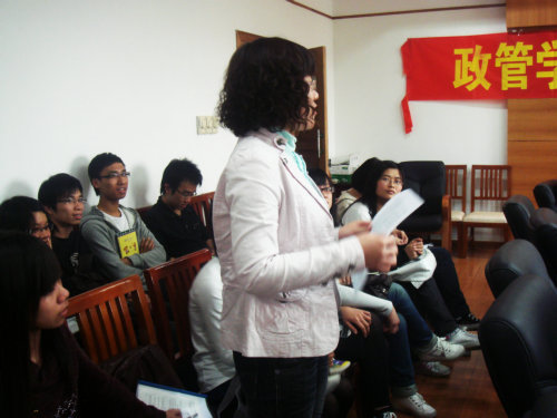 学生代表弟莉分享了她学习《国家教育改革和发展规划纲要》(征求意见稿)的心得,并对教育公平、高考制度改革、城乡教育水平差距和教育多元化等问题发表了看法。顾也力对弟莉的发言表示了赞赏,并鼓励政管师生多多了解两会,关注时事,努力把握机会锻炼自己。与此同时,他还认真回答了师生代表的提问,并强调学生要结合专业,理论联系实际,注重思维方法与模式的培养,不断提高发现问题、思考问题的能力。