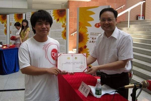 石佑启为“我为亚运潮”征文比赛一等奖获得者颁奖