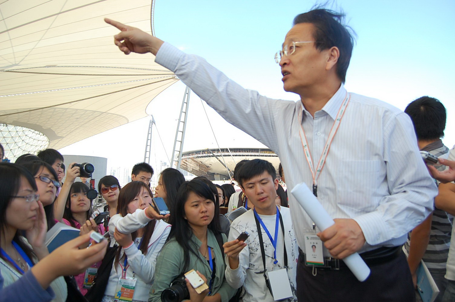 中国馆设计团队主持人是来自华南理工大学建筑学院院长何镜堂。这座高约69米,总建筑面积达16万平方米的“东方之冠”,是整个世博园区内最高的建筑。徐宝均介绍,中国馆内外各有三种和四种红颜色,整个展馆共由七种不同的红色构成,但由于受高度差异及阳光照射的影响,七种红颜色最终巧妙融成同一种红色,使整个中国馆浑然一体。