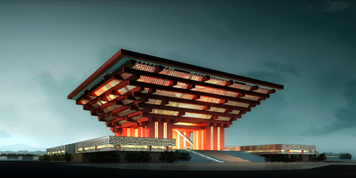 中国馆该穿什么“衣服”好呢?经过与专家商议,中国馆借鉴故宫的色彩采取多种红的渐变。于是就有了中国馆外表从上到下,由深到浅四种红色的“退晕”渐变,从而加强了“中国红”整体的层次感和空间感。