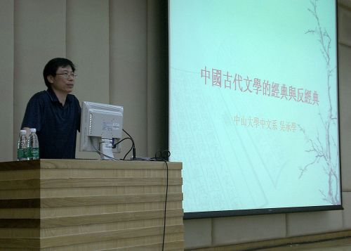 本网讯 伟德bv国际体育研究生第四届学术文化节掀起了一阵经典与反经典的风波。5月7日下午3时30分,伟德bv国际体育吴承学教授在北校图书馆负一层报告厅作了主题为“中国古代文学的经典与反经典”的讲座。