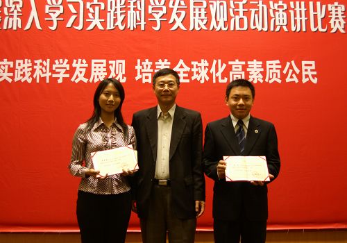 并列一等奖得主、仅有的两位学生参赛选手之一、学生党员苏希露,则从北京大学优秀大学生、世界文化交流青年使者郭晓春的经历出发,结合大学期间自己所参与的课程、活动、比赛的收益,探讨了在全球化的背景下,中国的大学生如何去成为具有国际能力的高素质公民,如何把科学发展观与大学生的教育结合起来,挖掘自己的创新能力,争取成为优秀青年。她表示,实践科学发展观,要培养的就是像郭晓春一样全球化、高素质的人才,广外像是一个宝库,为学生提供了成才的机会,让学生与世界连在一起,给了她展示的舞台,她“为自己是广外学子而骄傲。”苏希露也在演讲中表示,学生要培养独立思考能力、创造和想象力、动手实践能力,还要提高文明礼貌方面的修养。她的整个演讲沉稳而不失活泼,严肃而不失生动,展现了广外学子的风采。