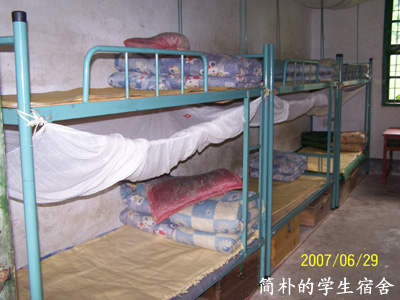 东坪中心小学位于京珠高速公路最雄伟的粤北路段,学校夹在两山之间,面朝小河背靠大山,高速公路就从学校后面经过,地理位置十分险峻。东坪中心小学主要招收附近山区的瑶族学生,现有学生217人。黄校长向考察团介绍,由于学生住地比较分散(个别学生返家需要步行4到5个小时),而且山区道路难行,因此学生以寄宿为主。由于山区学生家境普遍比较贫寒,为了节省伙食费,学生都自带大米和咸菜,交由学校食堂代为蒸煮。尽管生活条件比较艰苦,但是考察团成员从孩子们宿舍整洁的内务卫生可以感受到他们对生活的热忱和期待。