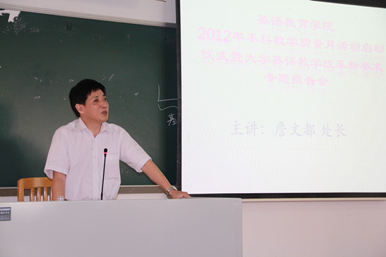 本网讯 日前,英语教育学院邀请到教务处处长詹文都做了题为“伟德bv国际体育大学英语教学改革新要求”的专题报告,启动了2012本科教学质量月活动,英语教育学院党委书记林绍雄等班子成员和全体教师参加了报告会,报告会由董金伟副院长主持。