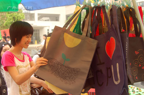 为迎合绿色奥运的时尚,许多摊位都摆出了环保袋。这些环保袋大都是同学自己缝制和手绘的,价格在6—15块不等,可谓物美价廉。有同学表示,6月1日起,又康超市会收取一次性塑料袋的费用,现在买个环保袋即节约又保护环境。