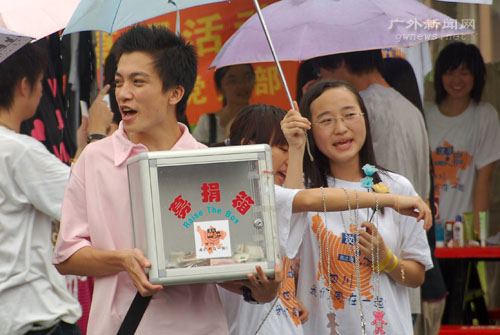 “只需一块钱,就可以买三颗好吃的怡口莲,请你献出小小的爱心!”抱着一大盒糖果的川渝学子们在校道上叫唤,也吸引了不少同学驻足献爱心。