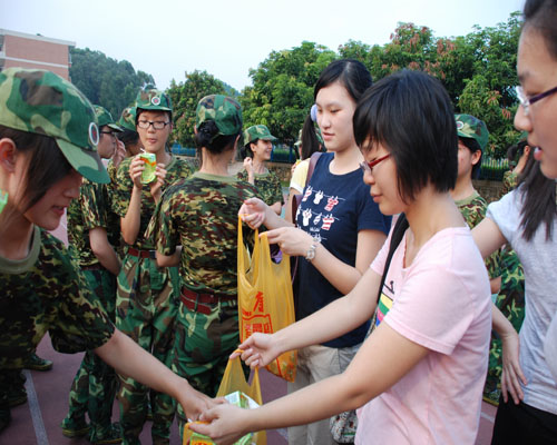 随后,翻译学院团学干部也来到军训现场,为新生带来凉茶、食品等慰问物品,并与同学们就学院团学的基本架构简介以及招新情况作了现场交流,师兄师姐带来的关怀与热情让训练间隙的气氛变得温馨而热烈。