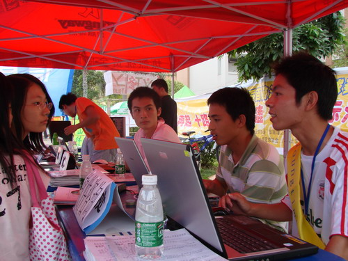 上午十点,活动正式开始,包括维修和咨询两个环节,时至中午放学时段,路过现场并寻求维修和咨询的同学渐渐增多,同学纷纷将出现故障的爱机搬到现场接受维修,信息学院的同学就电脑硬件、软件方面的问题作了详尽的解答。