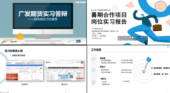 广发期货—广外商英实践基地以广发期货为依托,自2021年筹建以来,面向商英学院大二大三国际商务与商务英语专业提供为期四周的实习。现已具有完备的管理规定、完善的实践教学基础条件、稳定的合作基础。该实践基地为学院专题调研给予力所能及的场地及环境支持,学院邀请或聘请企业工作人员开设国际商务领域相关的知识讲座,学生亦可在实践基地检验学习成果、在实践中提升综合能力,实现以实践活动带动师生教学互促,通过实践反馈、总结分享等反哺现有教学。