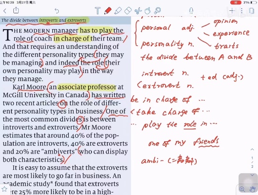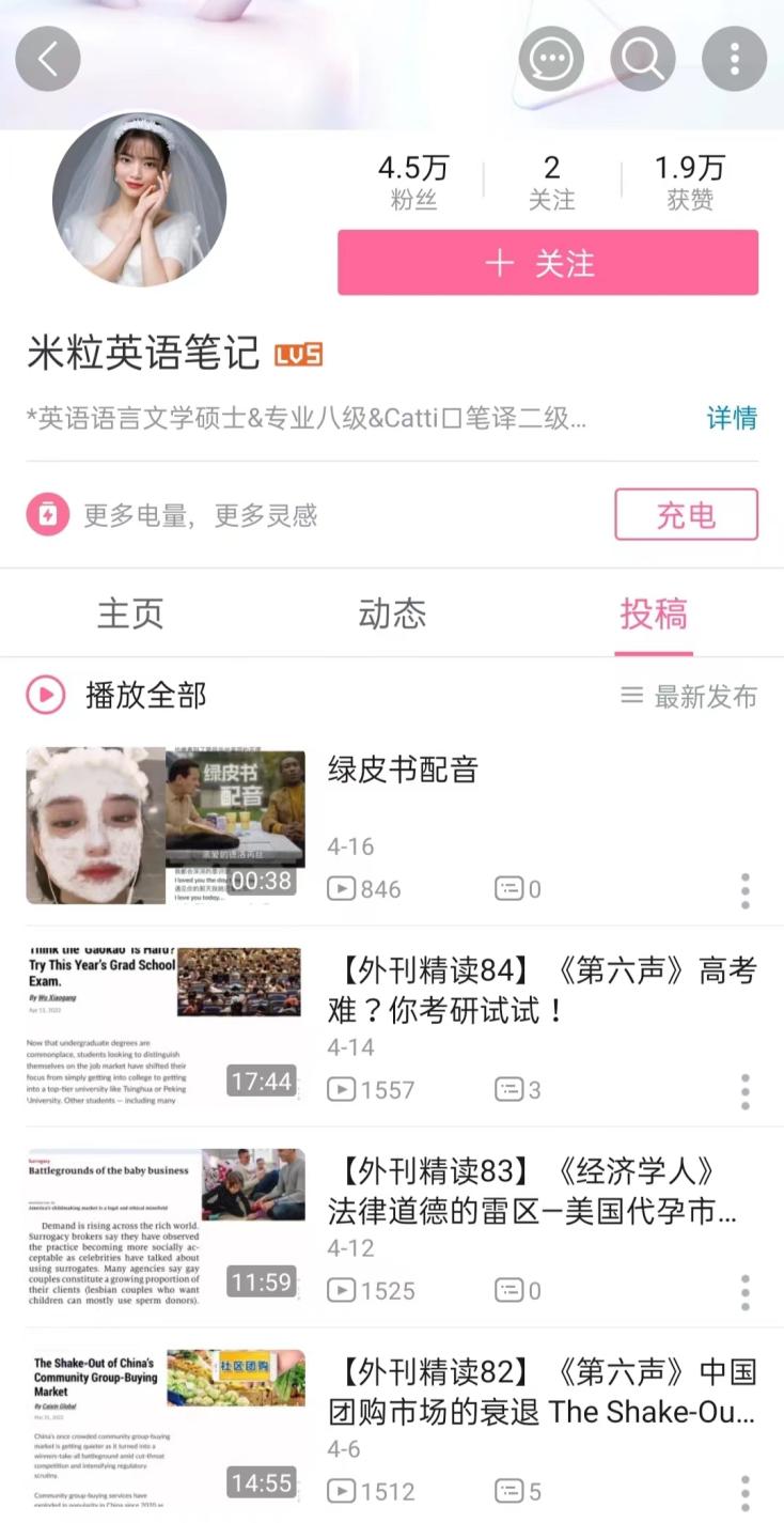 “米粒英语笔记”是孙廉咪B站的账号名。取这个名字的原因,孙廉咪在自己的公众号中解释道,自己名字中的“咪咪”是英文名“Miriam”的简称,而在广外读书时被朋友称为“米粒亚姆”,所以干脆就采用了“米粒”这个名字。目前,她已经在B站上投稿了七十多条视频,绝大多数内容是英语外刊精读,长度在几分钟到二十分钟不等。在视频里,屏幕左半边是材料文本,右半边是白板,孙廉咪就像上课一样,一边认真地逐句分析“课文”,一边用红色记号笔写板书。