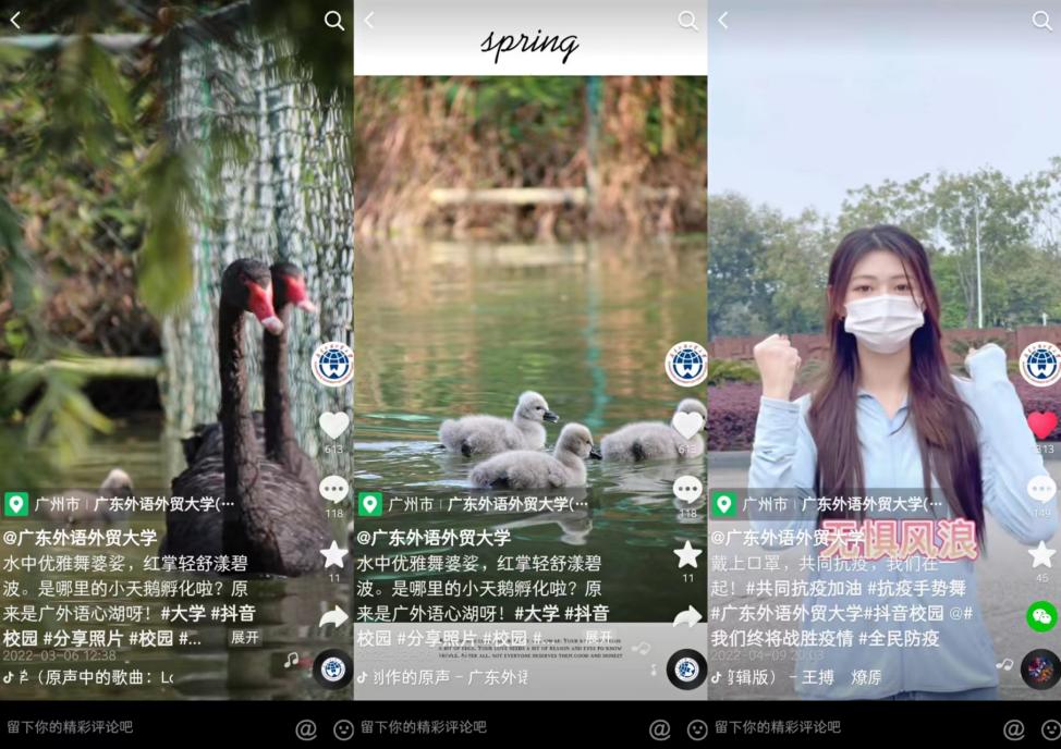 尽管出现的时间短暂,但在对广外正面形象的宣传上,新媒体团队功不可没。人们透过短短的十几秒到几分钟的视频,就能够窥见一个鸟语花香、生机勃勃的广外校园。“水中优雅舞婆娑,红掌轻舒漾碧波”,视频里天鹅宝宝娇憨灵动;落日余晖,晚霞映春色,广外新媒体团队用镜头将美好定格;高考十日倒计时,广外用多种语言为高三学子加油打气,约定共赴九月之约;疫情之下,广外学子用生动的手势舞提醒大家戴好口罩做好个人防护……