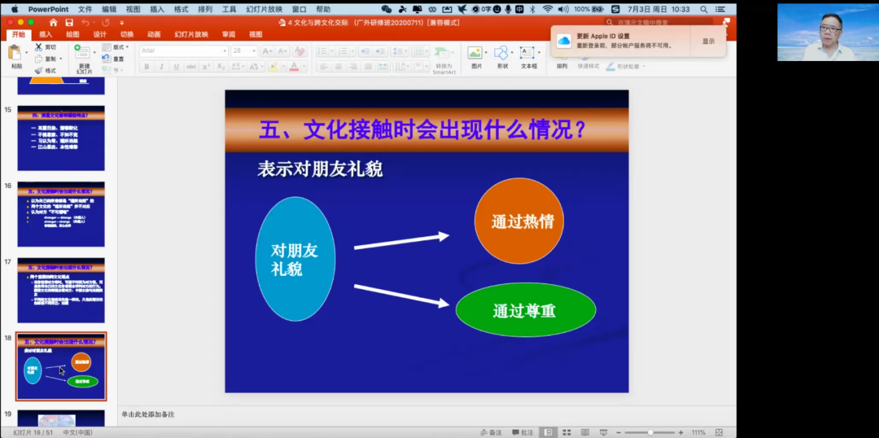 “内化于心,外化于行”。习近平总书记指出:讲好中国故事,传播好中国声音,展示真实、立体、全面的中国,是加强我国国际传播能力建设的重要任务。此次研修班开设了“中法跨文化交际”、“中外文化差异”、“中国广东与俄罗斯合作交流故事会”等内容,举行了“中国与波兰海外留学生的融入现状”、“浅谈中希文化的异同”、“捷克非物质文化遗产”等专题讲座,通过了解中外文化的对比、中外交流的现状和历史等内容,进一步树立学员的国家认同感和民族自豪感,学好外语,讲好中国故事。