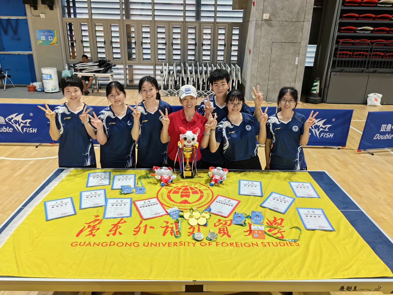 在领奖台上闪耀的不仅是奖牌的光芒,更是队员们日复一日刻苦训练的结晶。这份荣誉背后,是无数个在训练馆挥汗如雨的日夜,是教练团队的悉心指导,更是广外体育精神的生动体现。主教练孙艳玲老师从赛前备战到临场指挥都倾注了大量心血,她以丰富的带队经验为队员们保驾护航,在关键时刻给予心理疏导和战术建议。教练员王道平老师和黄泽鑫队长凭借专业的执教水平,针对每位队员的特点制定个性化训练方案,在技术上精雕细琢,在战术上运筹帷幄。体育部的老师们则在后勤保障上不遗余力,从训练场地安排到参赛物资准备,从体能康复到营养补给,为队员们创造了最优质的备战环境。