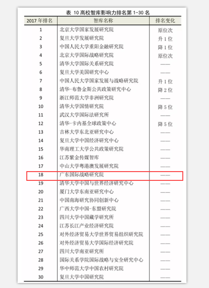 2018-11-29 广东国际战略研究院位列高校智库影响力排名第18位本网讯 近日,四川省社会科学院与中国科学院成都文献情报中心联合发布了《中华智库影响力报告(2018)》(以下简称《报告》),广东国际战略研究院在高校智库影响… [详细]