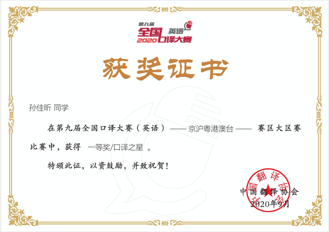 2020-09-29 翻译学院学子在国际国内口译大赛中获佳绩本网讯近日,伟德bv国际体育翻译学院学子在国际国内口译大赛中斩获佳绩。在第九届全国英语口译大赛京沪粤港澳台大区赛中,翻译学子孙佳昕荣获赛区第一名(一等奖)及口译之… [详细]