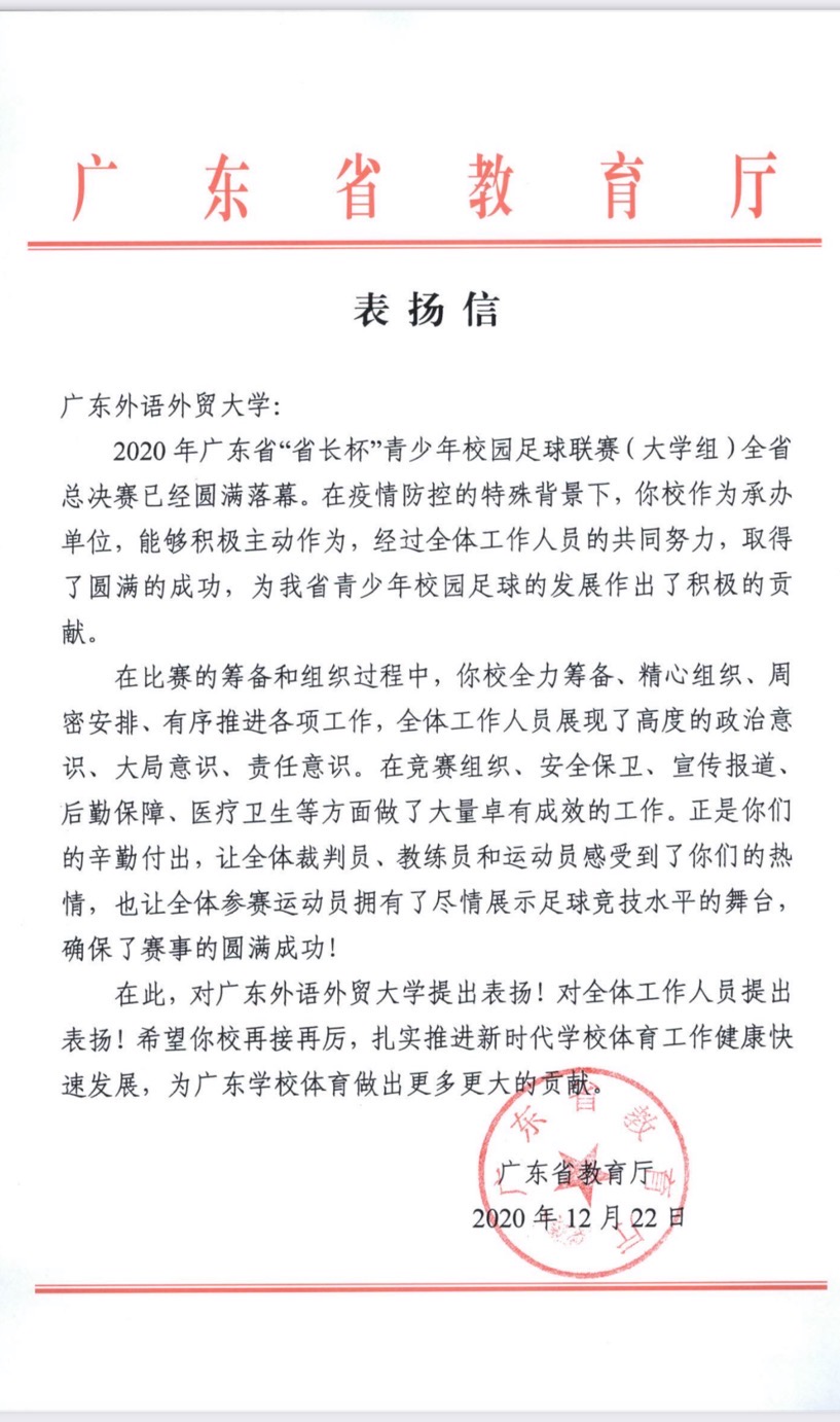 2020-12-28 广东省教育厅向伟德bv国际体育发来表扬信本网讯近日,广东省教育厅向伟德bv国际体育发来表扬信,对伟德bv国际体育在承办2020年广东省“省长杯”青少年校园足球联赛(大学组)全省总决赛中所作的积极贡献表示肯定,对全体工… [详细]