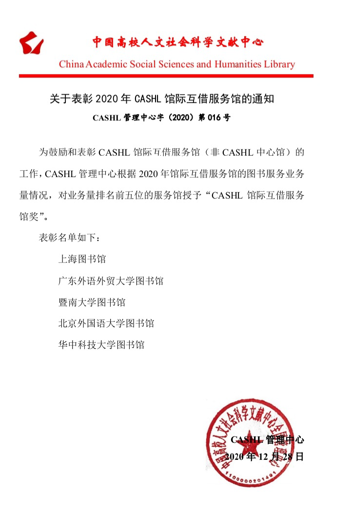 2020-12-31 伟德bv国际体育图书馆连续5年获“CASHL馆际互借服务馆奖”本网讯近日,伟德bv国际体育图书馆获2020年度“CASHL馆际互借服务馆奖”(全国排名第二)。这是伟德bv国际体育连续5年获得此项殊荣。CASHL是中国高等人文社会科学文献中心(ChinaAc… [详细]