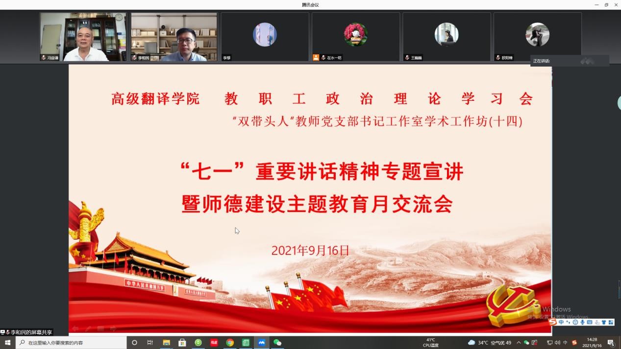 2021-09-27 【党史宣讲】翻译学院召开习近平总书记“七一”重要讲话精…本网讯9月16日下午,翻译学院举行教职工政治理论学习会与“双带头人”教师党支部书记工作室学术工作坊(十四),主题为学习习近平总书记“七一”重要讲话精神与… [详细]