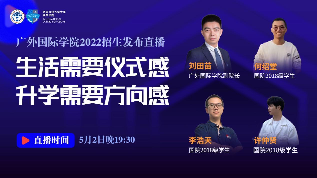 2022-05-12 国际学院举办2022招生发布会本网讯近日,广外国际学院举办2022线上招生发布会。活动在广外国际学院哔哩哔哩、抖音、微信视频号、今日头条四大平台同时直播,吸引了上万名观众收看,100多… [详细]