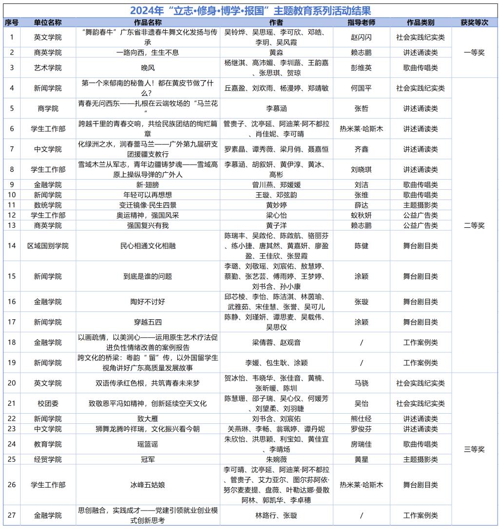 2025-01-27 伟德bv国际体育在2024年“立志·修身·博学·报国”主题教育系列活动中…本网讯近期,由广东省教育厅组织的2024年“立志·修身·博学·报国”主题教育系列活动公布结果,伟德bv国际体育共27项作品获奖,其中一等奖3项,二等奖16项,三等奖8项,我… [详细]