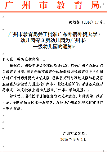 2016-09-12 广外幼儿园被批准为市一级幼儿园本网讯 近日,广州市教育局公布了幼儿园等级评估结果,伟德bv国际体育幼儿园被批准为广州市一级幼儿园。 [详细]