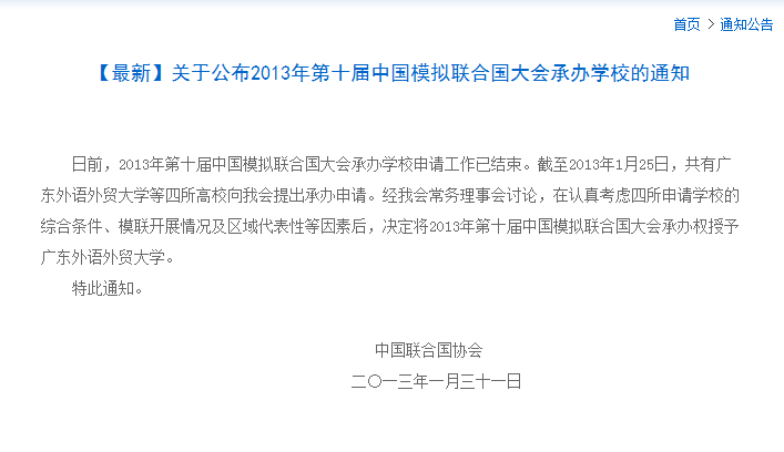 2013-07-09 中模专题网和广东模联人网站开通本网讯 第十届中国模拟联合国大会(CNMUN 2013)将于2013年11月8日—10日在伟德bv国际体育北校区召开,为方便各项工作的开展,第十届中国模拟联合国大会专题网和广东模… [详细]